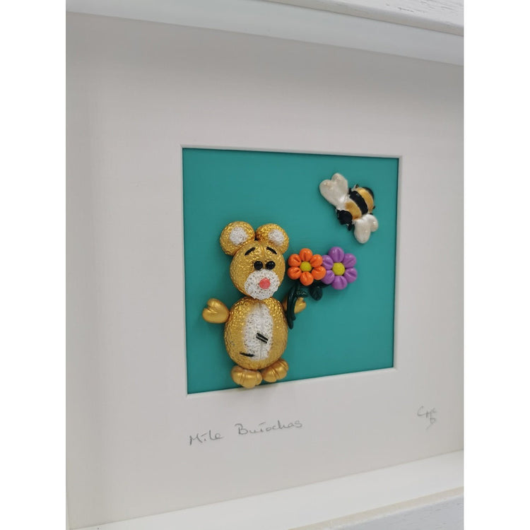 'Mile Buiochas' - Clay Bear holding flowers/Irish Thank You Wall Art